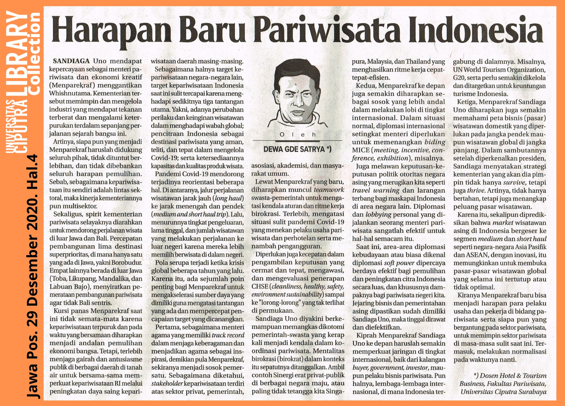 SANDIAGA Uno mendapat kepercayaan sebagai menteri pariwisata dan ekonomi kreatif (Menparekraf) menggantikan Whishnutama. Kementerian tersebut memimpin dan mengelola industri yang mendapat tekanan terberat dan mengalami keterpurukan terdalam sepanjang perjalanan sejarah bangsa ini.