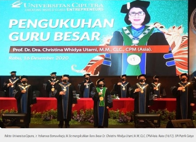 SURABAYAPAGI, Surabaya - Universitas Ciputra Surabaya, menggelar pengukuhan Guru Besar Fakultas Management Business (FMB), pada Rabu, (16/12/20), acara tersebut berlangsung di ruang Dian Auditorium Universitas Ciputra dengan protokol kesehatan yang cukup ketat.