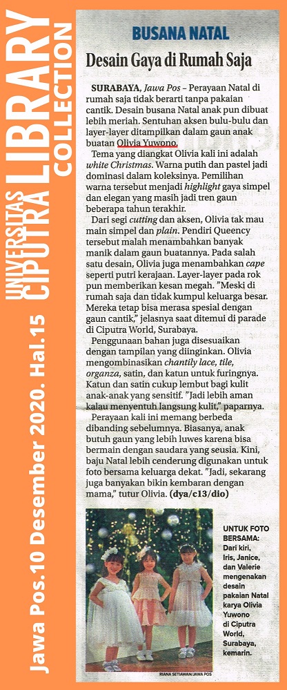 SURABAYA, Jawa Pos – Perayaan Natal di rumah saja tidak berarti tanpa pakaian cantik. Desain busana Natal anak pun dibuat lebih merian. Sentuhan aksen bulu-bulu dan layer-layer ditampilkan dalam gaun anak buatan Olivia Yuwono.
