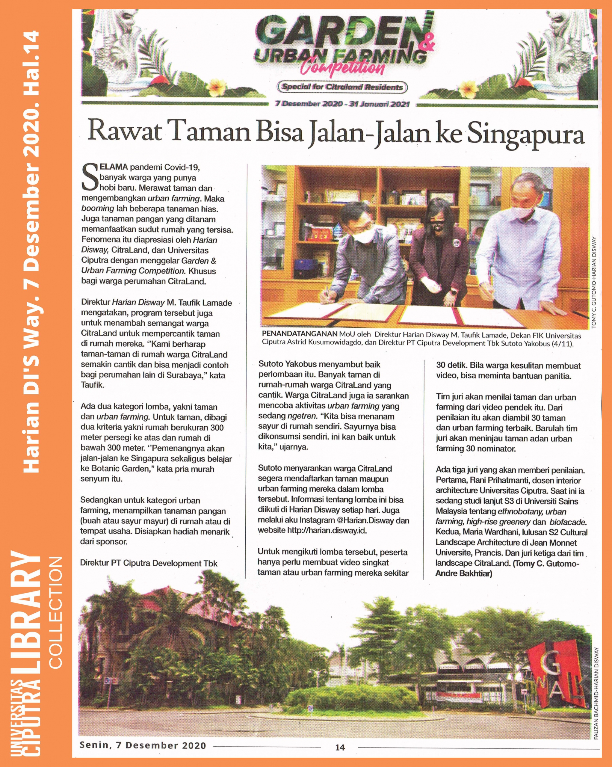 SELAMA pandemi Covid-19, banyak warga yang punya hobi baru. Merawat taman dan mengembangkan urban farming. Maka booming lah beberapa tanaman hias. Juga tanaman pangan yang ditanam memanfaatkan sudut rumah yang tersisa. Fenomena itu diapresiasi oleh Harian Disway, CitraLand, dan Universitas Ciputra dengan menggelar Garden & Urban Farming Competition. Khusus bagi warga perumahan CitraLand.