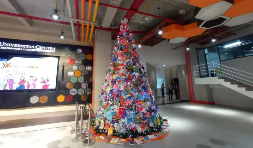 Perpustakaan Universitas Ciputra (UC) Surabaya, membuat pohon Natal dengan 1.000 buku entrepreneurship di gedung Coreprenur UC, pada Kamis (15/12/2022).