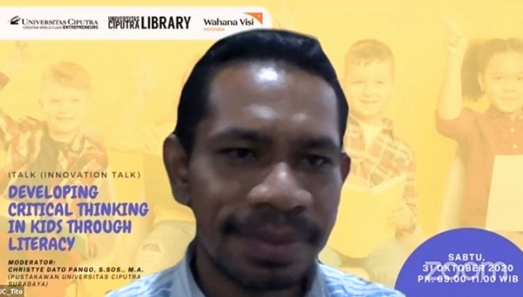 Kegiatan ini diharapkan memberikan wawasan yang dapat diterapkan oleh orang dewasa seperti orang tua dan pendidik yang sedang mengalami kesulitan dalam meningkatkan daya kritis anak melalui literasi. Kegiatan ini dimoderatori oleh Christye Dato Pango, S.Sos., M.A. (Pustakawan Universitas Ciputra Surabaya) dan mengundang Melliana Layuk (Spesialis Pendidikan Wahana Visi Indonesia Zonal Jawa, Sumatera dan Kalimantan Barat) dan Meilani Sandjaja, S.Psi., M.Psi., Psikolog (Dosen Fakultas Psikologi Universitas Ciputra Surabaya)