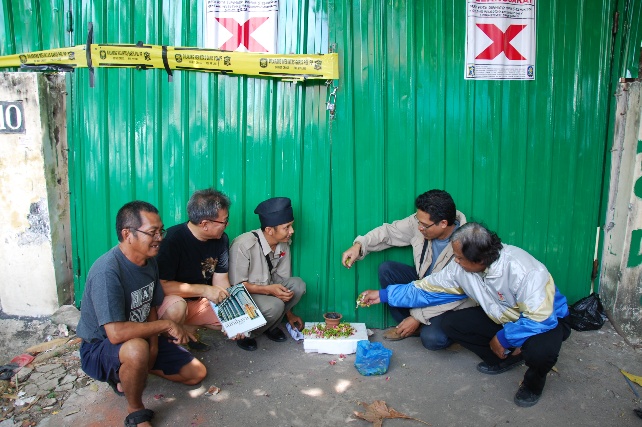 Lima orang anggota komunitas Pemerhati Sejarah Surabaya bakar kemenyan dan menabur bunga di depan pintu penutup Rumah Radio Pemberontakan Bung Tomo, di Jalan Mawar Nomor 10, Tegalsari, Kamis (5/5/2016).
