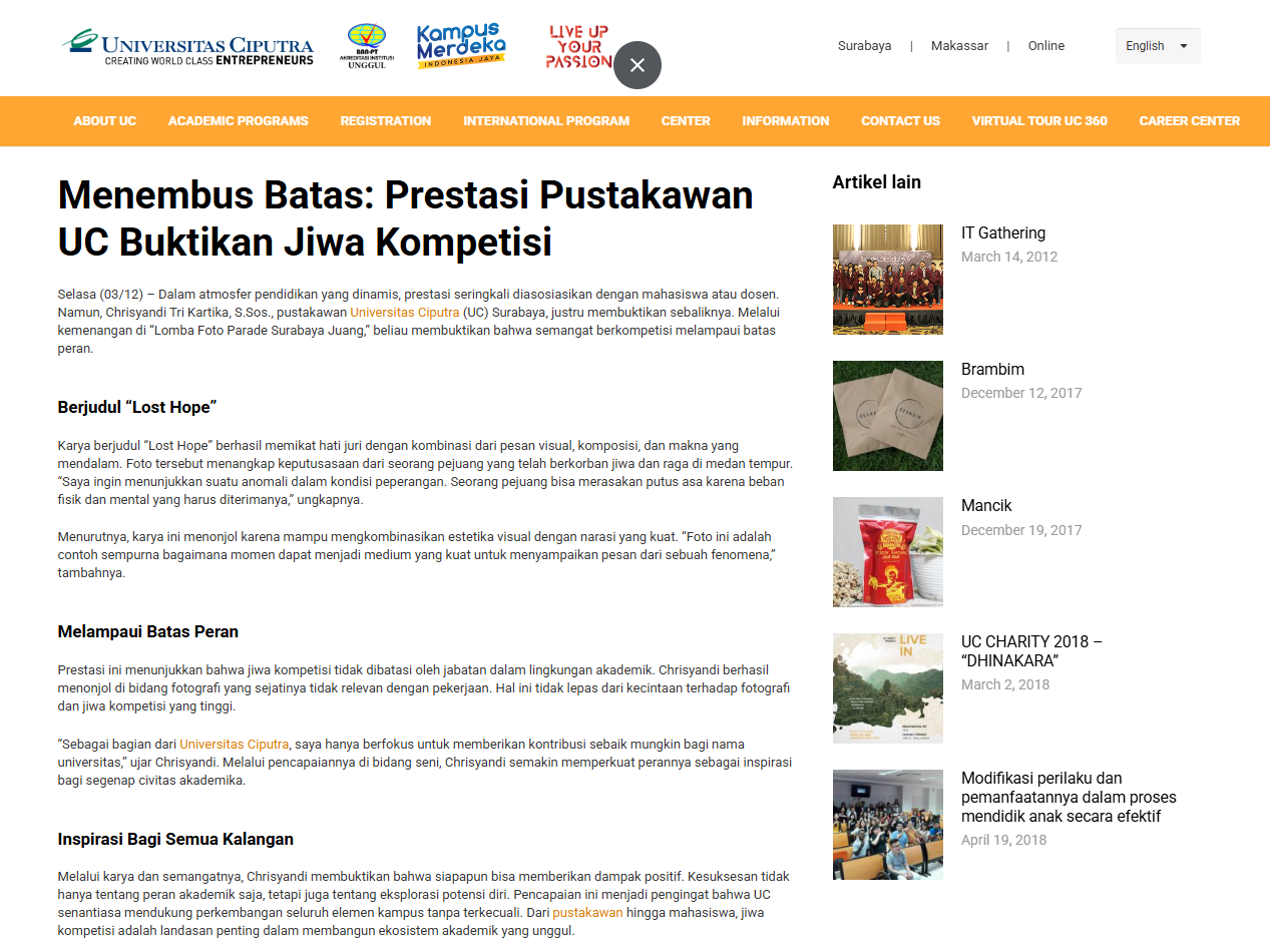 Dalam atmosfer pendidikan yang dinamis, prestasi seringkali diasosiasikan dengan mahasiswa atau dosen. Namun, Chrisyandi Tri Kartika, S.Sos., pustakawan Universitas Ciputra (UC) Surabaya, justru membuktikan sebaliknya. Melalui kemenangan di “Lomba Foto Parade Surabaya Juang,” beliau membuktikan bahwa semangat berkompetisi melampaui batas peran.
