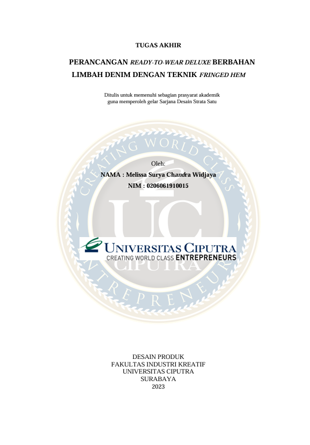 Industri tekstil adalah industri yang membutuhkan pemakaian air yang sangat banyak. Intensifitas tinggi yang dihasilkan karena pemakaian air yang banyak lama kelamaan menghasilkan limbah cair yang dapat mempangaruhi lingkungan sekitar. Limbah cair yang dihasilkan pada saat proses pewarnaan juga dapat membahayakan lingkungan sekitar, apalagi jika dibuang ke lingkungan secara berkala. Tidak banyak yang mengetahui bahwasanya ada banyak cara untuk mengolah limbah kain denim agar pencemaran lingkungan dapat berkurang. Maka dari itu diciptakan perancangan ini yang membahas mengenai perancangan Ready-to-wear deluxe dengan penggunaan limbah denim yang menggunakan variasi teknik fringed hem. Perancangan ini menggunakan metode kualitatif yang menggunakan tahapan design thinking, sehingga kita dapat menggali kebutuhan konsumen secara mendalam. Tujuan dari rancangan koleksi busana Ready-to wear deluxe ini memadukan antara limbah kain denim dengan beberapa variasi teknik fringed hem, sehingga menghasilkan suatu koleksi yang unik. Hasil penelitian yang telah dilakukan menunjukan bahwa perancangan koleksi yang telah dikerjakan dapat menjadi solusi dalam permasalahan limbah kain denim.