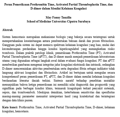 Sistem hemostasis merupakan mekanisme biologis yang bekerja secara terintegrasi untuk mempertahankan keseimbangan antara pembentukan bekuan darah dan proses fibrinolisis. Gangguan pada sistem ini dapat memicu spektrum kelainan koagulasi yang luas, mulai dari kecenderungan perdarahan hingga kondisi hiperkoagulabel yang meningkatkan risiko trombosis. Dalam praktik patologi klinik, pemeriksaan Prothrombin Time (PT), Activated Partial Thromboplastin Time (aPTT), dan D-dimer masih menjadi pemeriksaan laboratorium utama yang digunakan sebagai langkah awal dalam evaluasi fungsi koagulasi. PT dan aPTT memberikan gambaran mengenai integritas jalur koagulasi ekstrinsik dan intrinsik, sedangkan D-dimer mencerminkan aktivitas pembentukan serta degradasi fibrin sebagai indikator tidak langsung aktivasi koagulasi dan fibrinolisis. Artikel ini bertujuan untuk mengulas secara komprehensif peran pemeriksaan PT, aPTT, dan D-dimer dalam menilai kelainan koagulasi berdasarkan literatur ilmiah terkini. Sintesis naratif terhadap penelitian mutakhir menunjukkan bahwa ketiga pemeriksaan ini memiliki nilai diagnostik dan prognostik yang signifikan pada berbagai kondisi klinis, termasuk koagulopati terkait penyakit sistemik, sepsis, dan tromboemboli. Meskipun demikian, keterbatasan sensitivitas dan spesifisitas masing-masing parameter menuntut interpretasi hasil yang kontekstual dan terintegrasi dengan data klinis pasien.