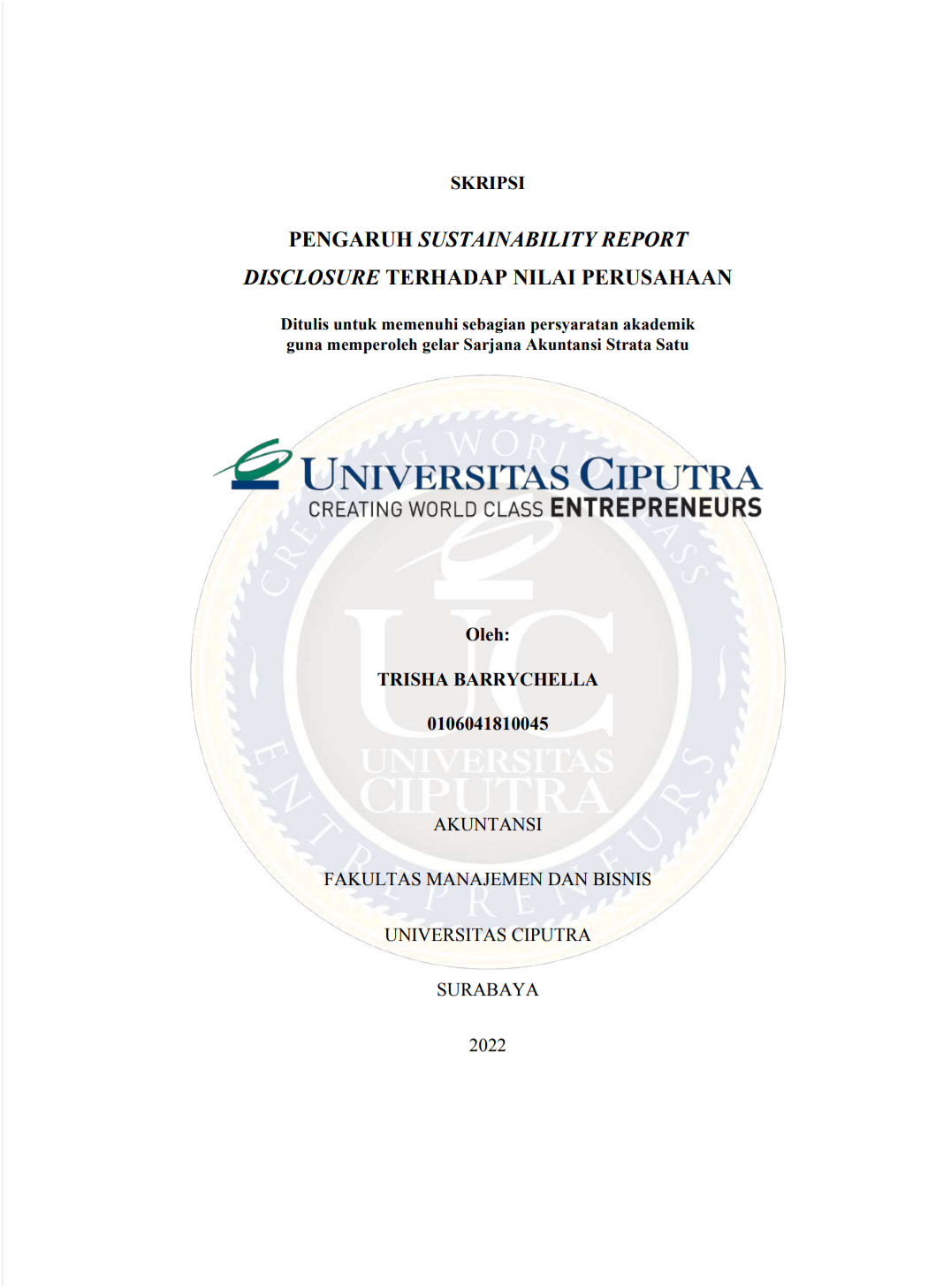 Perusahaan di Indonesia masih banyak yang salah dalam pembuatan dan pelaporan sustainability report karena menganggap pelaporan tersebut sebatas untuk menarik perhatian publik dan investor atau hanya untuk dilaporkan karena peraturan yang mewajibkan perusahaan. Laporan keberlanjutan atau sustainability report merupakan salah satu media bagi perusahaan untuk menunjukan rasa kepedulian mereka terhadap para pemangku kepentingan. Pengungkapan sustainability report semakin penting sehingga menyebabkan banyak peneliti untuk mempelajari faktor-faktor yang mempengaruhi pengungkapan dalam sustainability report dan keuntungannya jika mengungkapkan sustainability report dengan baik. Penelitian ini bertujuan untuk mengetahui aspek ekonomi, aspek sosial, aspek lingkungan, aspek governance, dan pengungkapan sustainability report secara keseluruhan berpengaruh terhadap nilai perusahaan. Sampel dalam penelitian ini adalah perusahaan yang terdaftar di ESG Quality 45 IDX KEHATI dan/ atau ESG Sector Leaders IDX KEHATI periode 20 Desember 2021 hingga 31 Mei 2022 dan menerbitkan laporan tahunan serta sustainability report untuk periode 2020. Teknik pengambilan sampel dalam penelitian ini menggunakan non- probability sampling dengan menggunakan metode purposive sampling. Analisis data dalam penelitian ini menggunakan uji asumsi klasik dan uji linear berganda. Hasil penelitian ini menyatakan bahwa aspek ekonomi, aspek sosial, aspek lingkungan, aspek governance, dan sustainability report disclosure secara keseluruhan melalui pengungkapan aspek ekonomi, lingkungan, sosial, dan governance tidak berpengaruh terhadap nilai perusahaan, akibat dari faktor yang mempengaruhi nilai perusahaan yaitu Covid-19, Indonesia sebagai negara berkembang, dan regulator, perusahaan, dan masyarakat Indonesia.